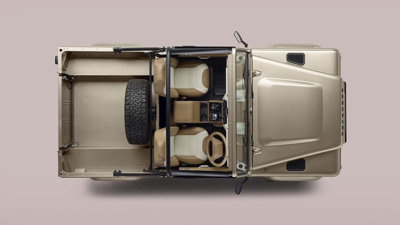 This is open-air freedom with refined aggression. The canvas soft top, available in four colors and two hood styles, can be unzipped and rolled for top-down drives, with nods to the original NAS 90’s design DNA. Inside, the cabin is just as customizable, with up to 13 leather options, a match-to-sample paint program, and even luxe extras like a surfboard rack or wine cooler. Whether you go for the classic 16-inch Wolf wheels or the tougher 18-inch Sawtooth alloys, the Defender’s stance is as bold as its brawn.
