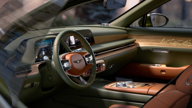 Step inside, and the design storytelling continues. The X Gran Coupe’s interior is all about nature, inspired by Mediterranean olive trees with earthy green and brown leather and delicate leaf motifs. Meanwhile, the Genesis X Gran Convertible leans into bold luxury, cloaked in a rich Cabernet-inspired blue that channels vineyard vibes.