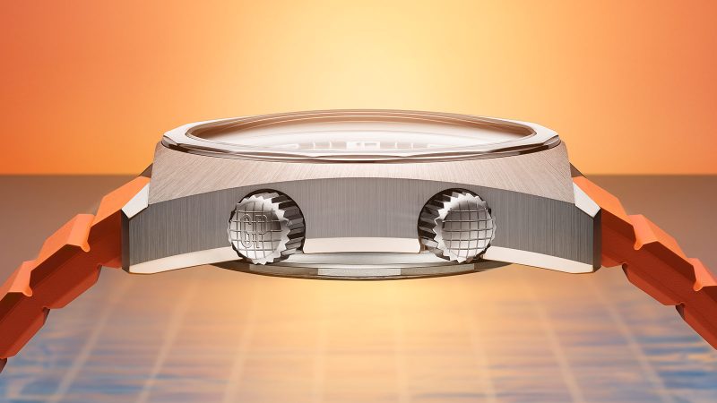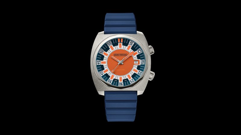 The updated Deep Diver features a cushion-shaped Grade 5 titanium case—lightweight, durable, and effortlessly sleek—measuring 40.3mm by 38mm for a perfectly balanced presence. The dial pays homage to the 1971 original with retro-futuristic typography and a vibrant blue, orange, and white palette. A rotating inner bezel, quick-release strap system, and dual strap options (blue and orange rubber) make this piece as versatile as it is eye-catching. Luminous markers and a date window add both functionality and flair.