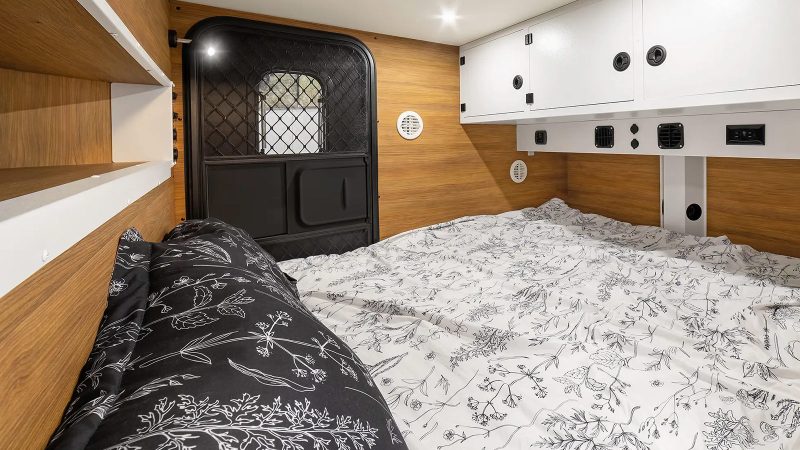 The Sasquatch XC Highland 60 electronics are well-protected and easily accessed via three bulkheads for charging, while the Propex 6500 BTU heater with digital controls is available for winter expeditions. For the interior, storage is available through the ROAM wall organizer, intuitively positioned around the spacious queen-sized bed with a memory foam mattress.