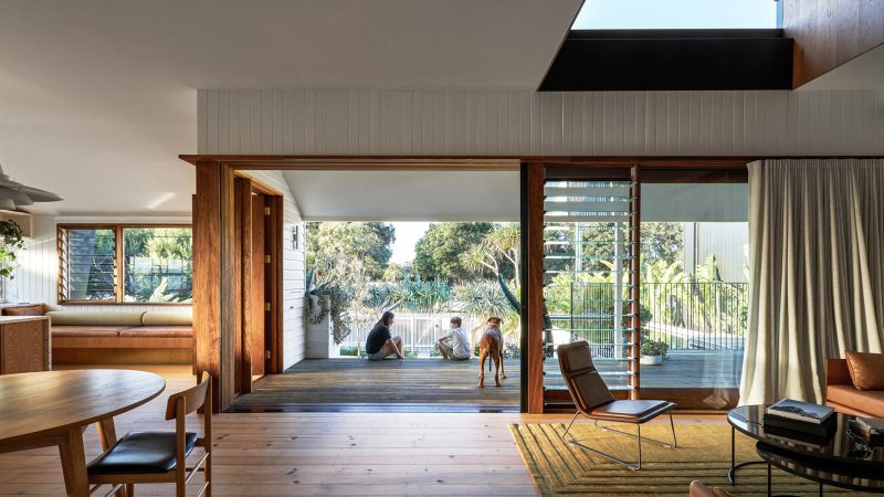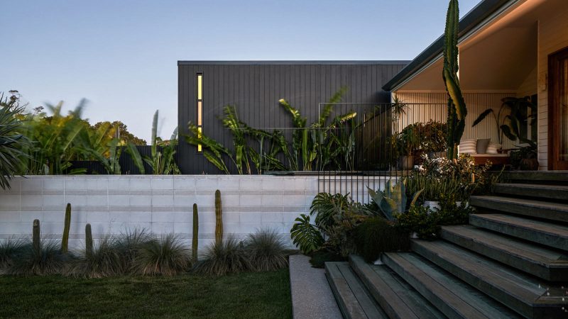 Elevated 1600mm above ground, the house discreetly stores essentials such as surfboards, water tanks, and solar systems, while broad timber steps lead to a front veranda that serves as a stage overlooking the adjacent park. With a footprint of just 140m², the space appears larger thanks to a minimalist material palette, thoughtful spatial planning, and light-maximizing design features, such as a generous skylight and a sliding glass door that opens to lush views.