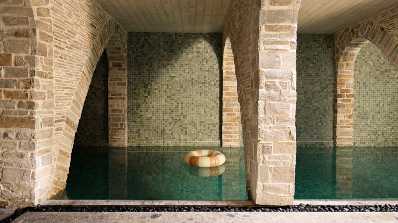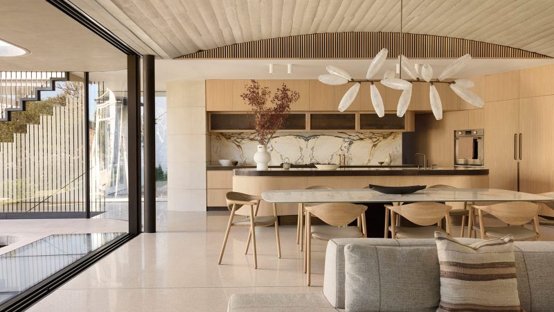 Beneath the main living area, the lower ground floor offers a wine cellar, cinema, gym, massage room, sauna, spa, and a sandstone-clad passageway leading to an underground garage. The real showstopper lies on the lowest level, where the revelatory swimming pool sits beneath sweeping stone arches inspired by Antoni Gaudi’s designs in Barcelona’s Park Güell. The parabolic arches create a striking visual and serve a structural purpose, supporting the weight of the upper floors and enhancing depth in the pool area.