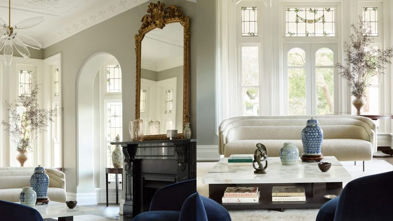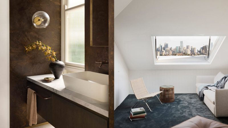 The original Victorian section of the home remains faithfully preserved, with only a few modern interventions to improve the flow of the space, including a new opening between the living and dining areas. Romaine Alwill’s interior design bridges the gap between eras, blending modernist elements with the late-Victorian vernacular. She restored the stained glass, archways, cornices, and ceiling roses while introducing cooler blues, rich timbers, and warmer tones in the new contemporary section.