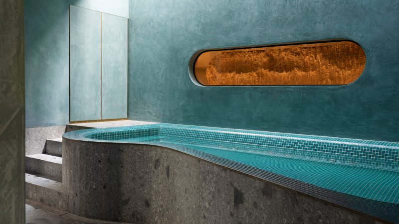 A seven-meter-long bank of skylights carved into the floors of the two levels above the pool elevates the pool’s ambiance. These skylights channel light into the space and offer glimpses of the sky. This thoughtful integration of natural light transforms what could have been a dark basement into an inviting, almost surreal retreat.