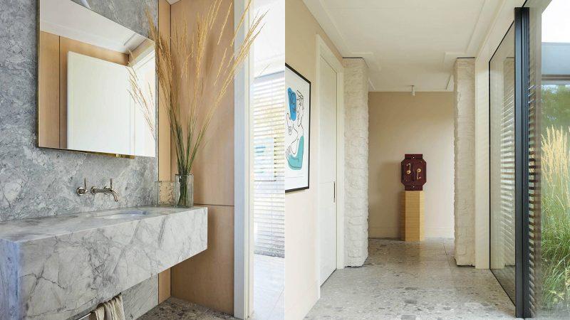 The design also prioritizes practical elements like oversized custom coffee tables and durable materials, making it a perfect fit for family life. The interior is awash with natural stone, from pitted travertine to elegant marble, each piece working harmoniously to create a sophisticated yet functional sanctuary.