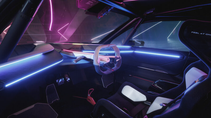 The Alpine A290_β looks like a cyberpunk rally car. It is based on the Renault 5 concept vehicle unveiled in 2021. However, this new concept takes it further with quad rally lights and vertical tail lights said to be derived from the A470 endurance race car. The paintwork is powder white with a contrasting partially black hood, roof, and blue forged carbon fiber. The 20-inch wheels feature a unique square cut in the center design and are wrapped in Michelin rubber.