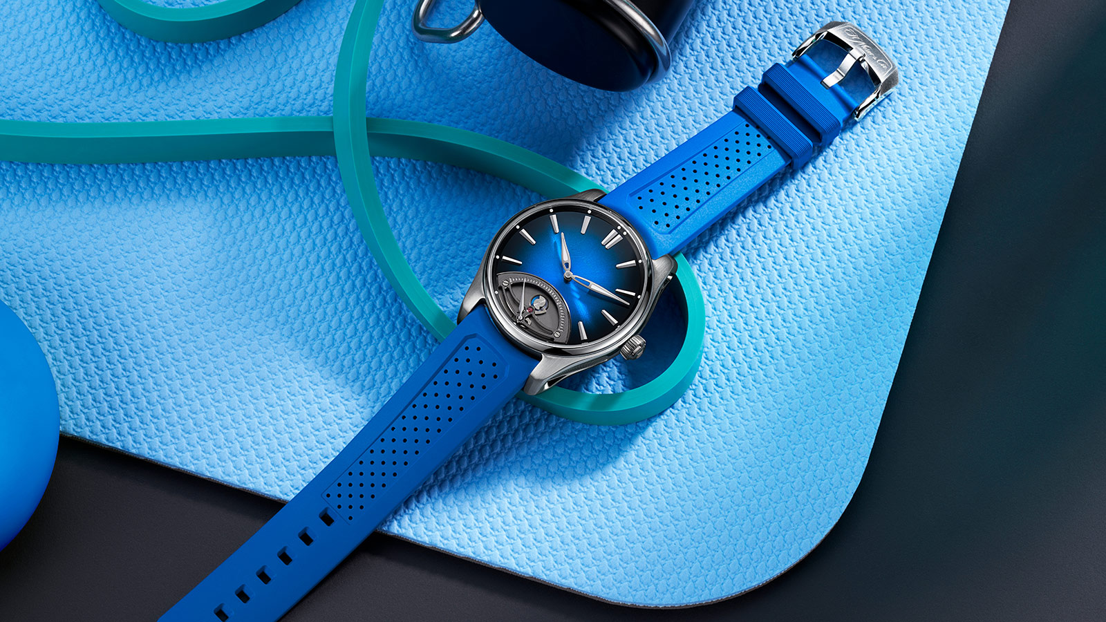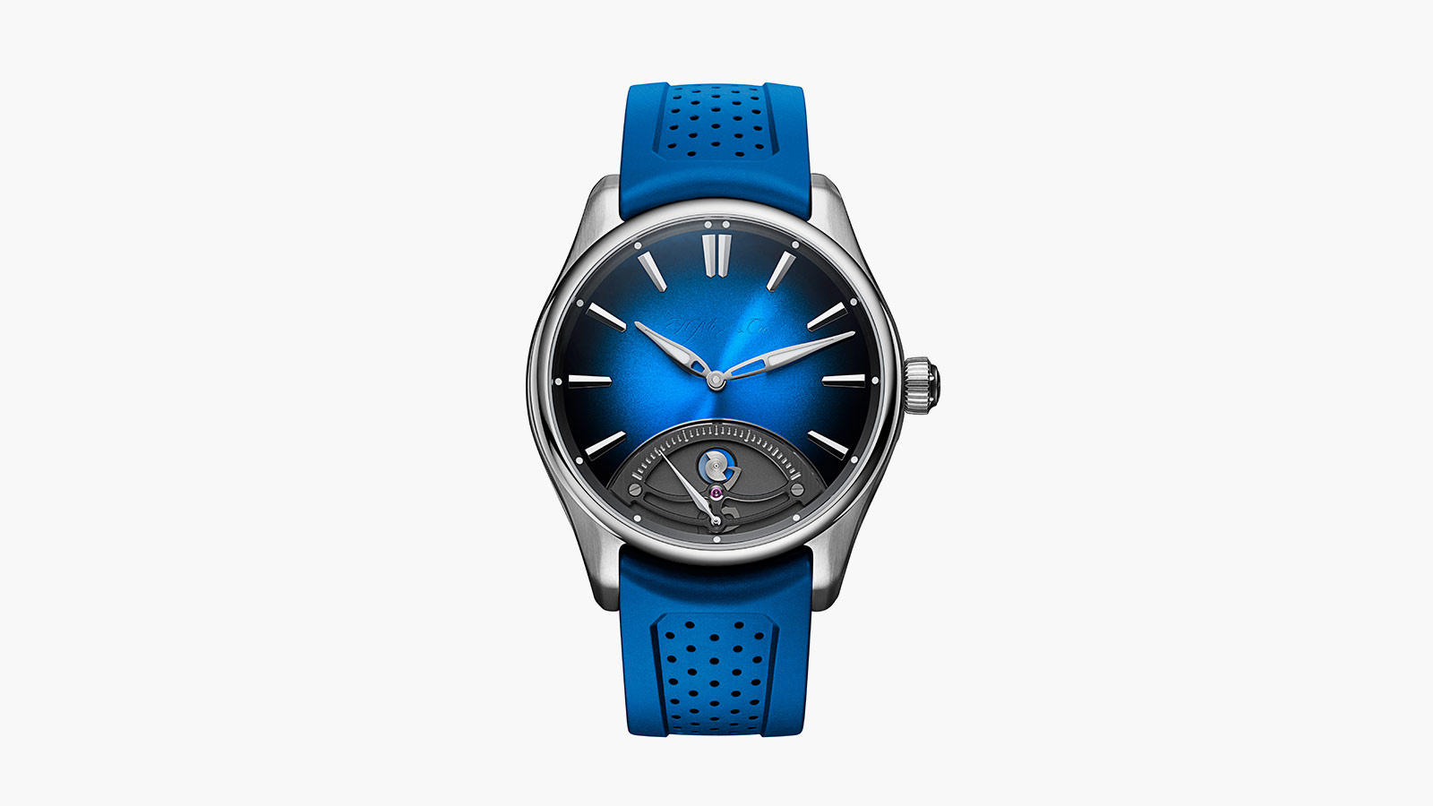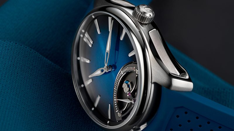 The Midnight Blue fumé dial maintains H. Moser & Cie’s minimalist ethos, with the brand’s logo subtly applied in transparent lacquer. This allows the dial’s captivating retrograde mechanism to take center stage, showcasing the brilliance of the HMC 250 automatic movement—a technical marvel developed in collaboration with Agenhor SA.