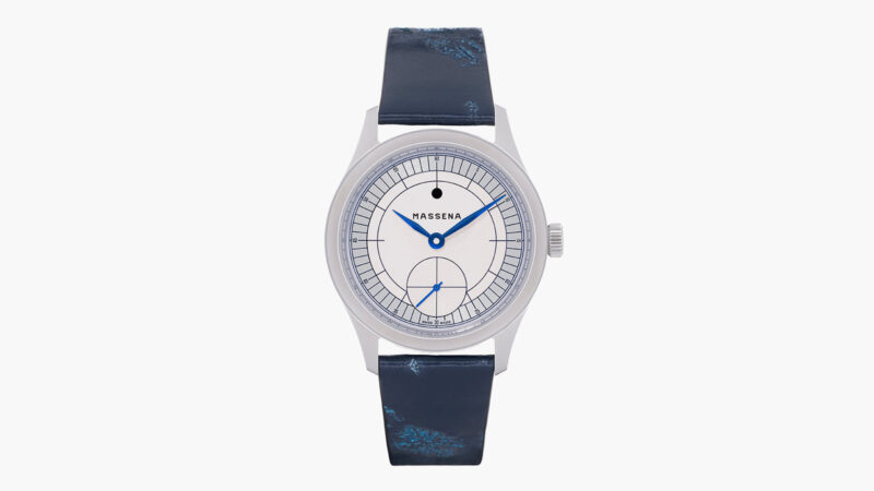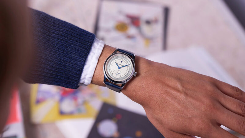 The Magraph’s dial draws inspiration from 1930s Bauhaus design, with its defined geometric shapes and straight lines. The dial is off-white in the center with a matte surface and features a circular-grained and rhodium-plated outermost sector ring. The finishing touch is the use of heated blued steel hours, minutes, and seconds hands. The style is minimalist yet poignant. The case is 38.5mm and stainless steel. It looks like it traveled through time from the 1930s and ’40s.