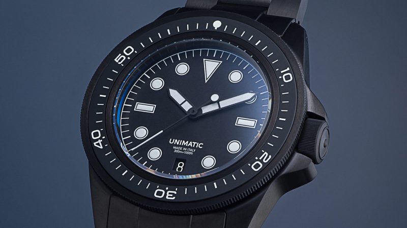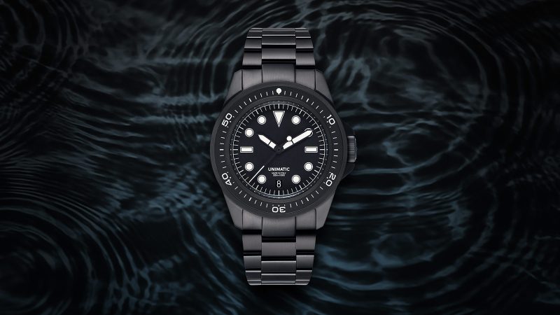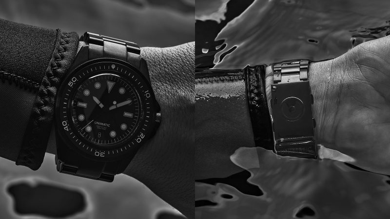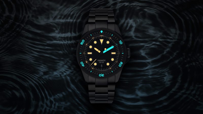 The U1S-MD is clad in a full brushed black DLC finish for the first time. It pairs UNIMATIC’s iconic diver case with a matching DLC stainless steel bracelet, delivering a cohesive look that’s as minimal as it is menacing. Rated to 300 meters of water resistance, the watch is packed with pro-level features: a 120-click safety bezel, screw-down crown, dual lume system with Super-LumiNova® BGW09 and custom OL orange lume, and a double-domed sapphire crystal with anti-reflective coating.
