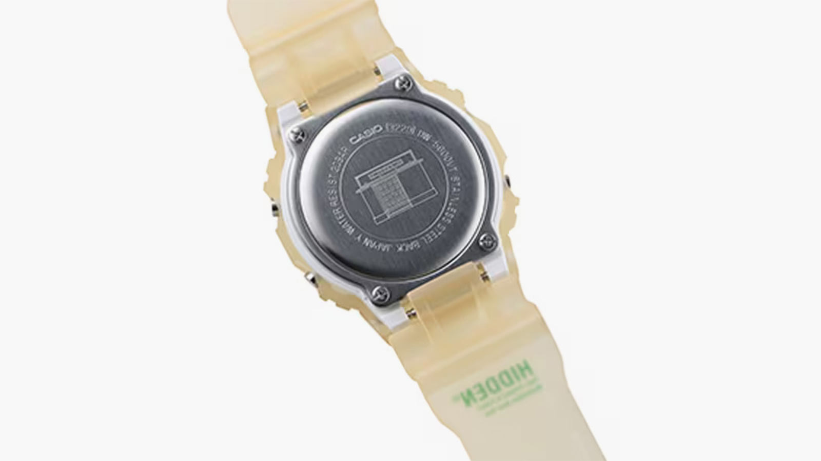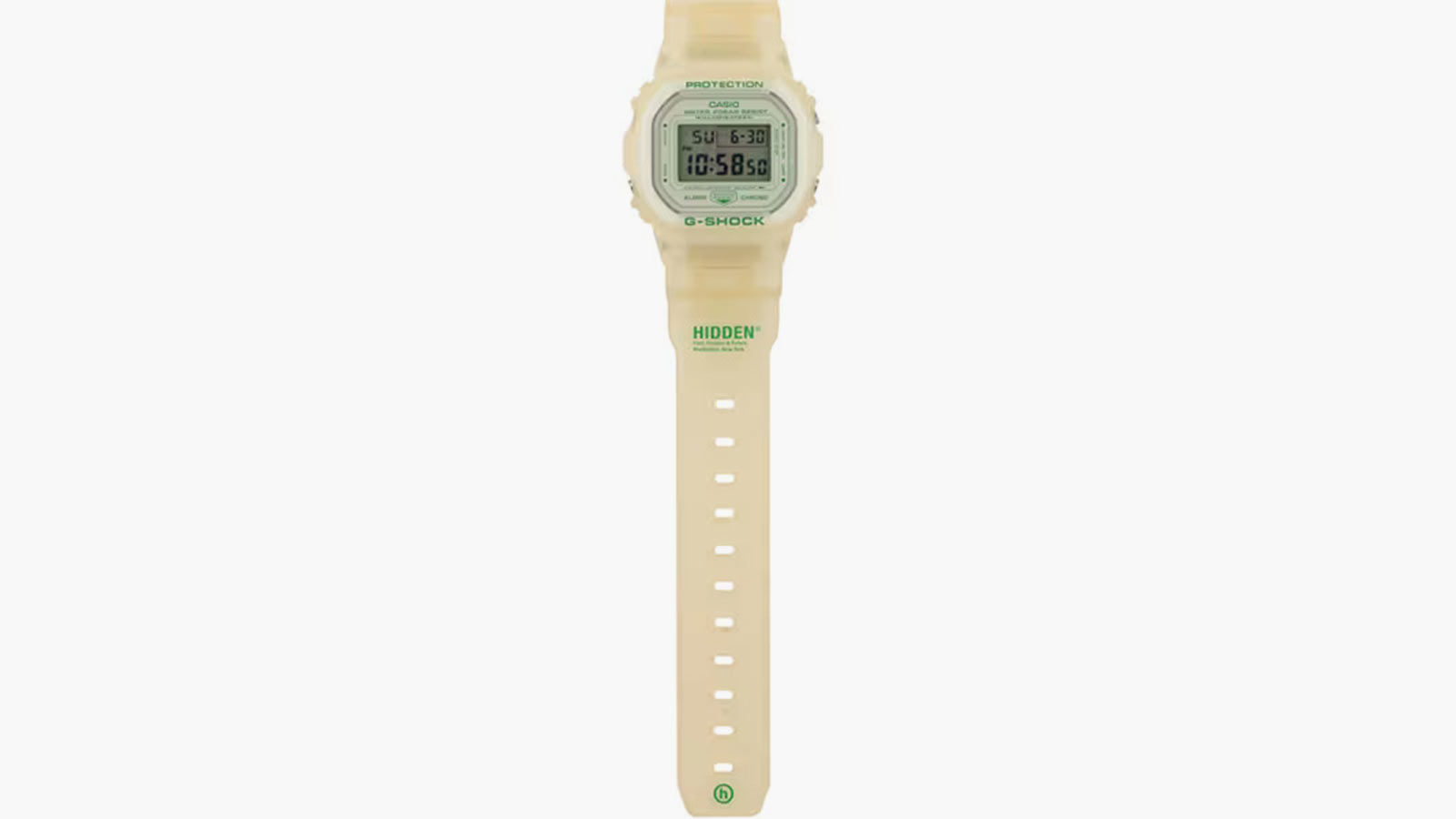 The DW5600HDN227 draws inspiration from G-SHOCK’s iconic DW5600 model, enveloped in a unique Yakult-like hue of opaque bone resin from case to band. The signature “Past, Present, and Future” mantra of HIDDEN NY adorns the band alongside its logo, both resplendent in a refreshing green color that accentuates the design.