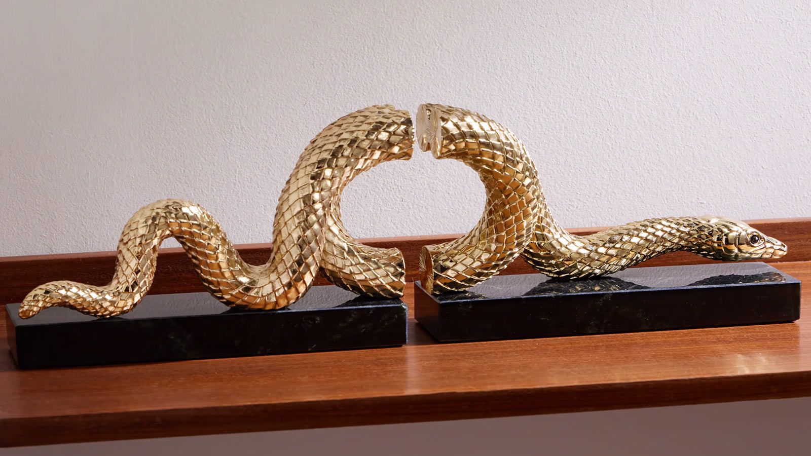 L’Objet’s Set of Two Gold-Plated Marble Bookends combines functional design with opulent elegance. They are beautifully sculpted and etched from gold-plated brass in the shape of a snake, which is believed to be a symbol of transformation and healing. Each is set on a sleek marble base, which makes them an even more opulent addition to your space. Perfectly balanced and visually striking, they bring a sophisticated touch to organizing prized books or showcasing favorite volumes in style.